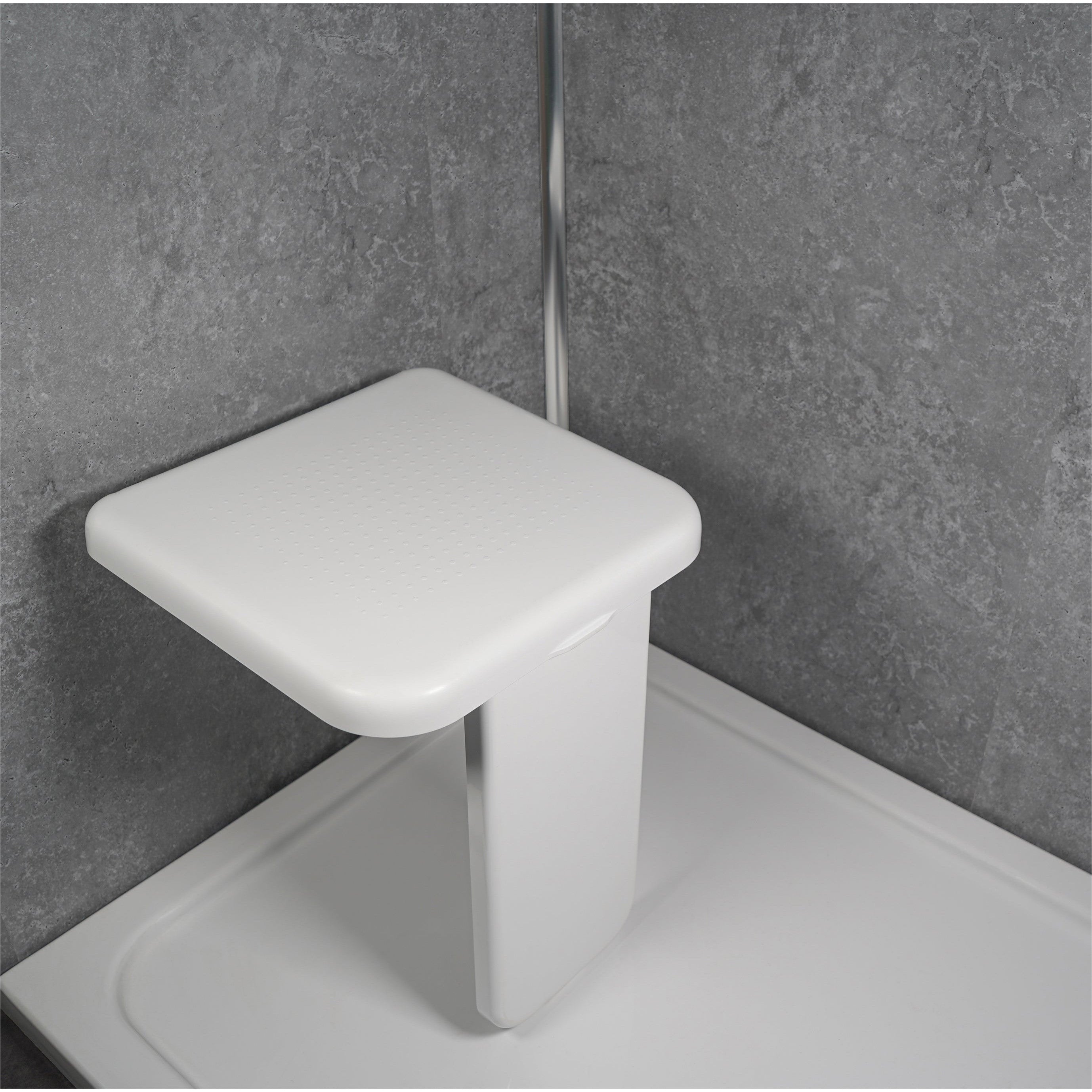 De opklapbare douchezitting met steunpoot is een modern vormgegeven, stabiele en ruimtebesparende oplossing voor veilig en comfortabel douchen. De zitting klapt soepel tegen de muur en heeft een ingeklapte diepte van slechts 80 mm, ideaal voor kleinere of gedeelde doucheruimtes.
