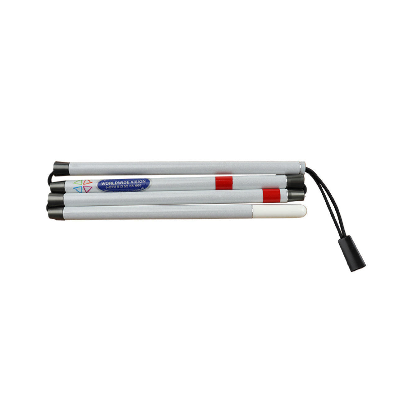 Erkennungsstab aus Aluminium mit Nylonspitze. Ausgestattet mit weißem Reflexstreifen und 2 roten Reflexstreifen. In vier Teile faltbar mit konischen Verbindungsstiften.