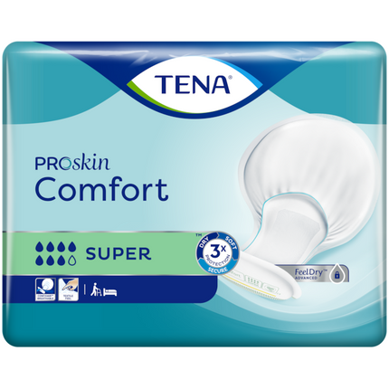 TENA Comfort Super ist eine bequeme, becherförmige Inkontinenzeinlage für Menschen, die ein Inkontinenzprodukt mit hoher Saugfähigkeit suchen und weiterhin eine Einlage verwenden möchten. Der einzigartige becherförmige Kern bietet Auslaufschutz und eine gute Passform. FeelDry Advanced™ leitet Feuchtigkeit schnell von der Oberfläche ab und hält die Haut trocken. Selbst größere Mengen Urin werden vom saugfähigen Kern schnell aufgefangen und sorgen für ein trockenes Gefühl, und die vollständig atmungsaktive Rückseite von ConfioAir lässt die Haut atmen. All diese Eigenschaften sorgen dafür, dass die natürliche Gesundheit der Haut erhalten bleibt. Diese bewährte Inkontinenzeinlage wird mit der wiederverwendbaren Fixierungshose TENA Fix an Ort und Stelle gehalten. TENA ProSkin Comfort kann im Hoch- oder Querformat angebracht werden und lässt sich leicht positionieren oder ändern. TENA ProSkin Comfort ist in verschiedenen Absorptionsstufen erhältlich.