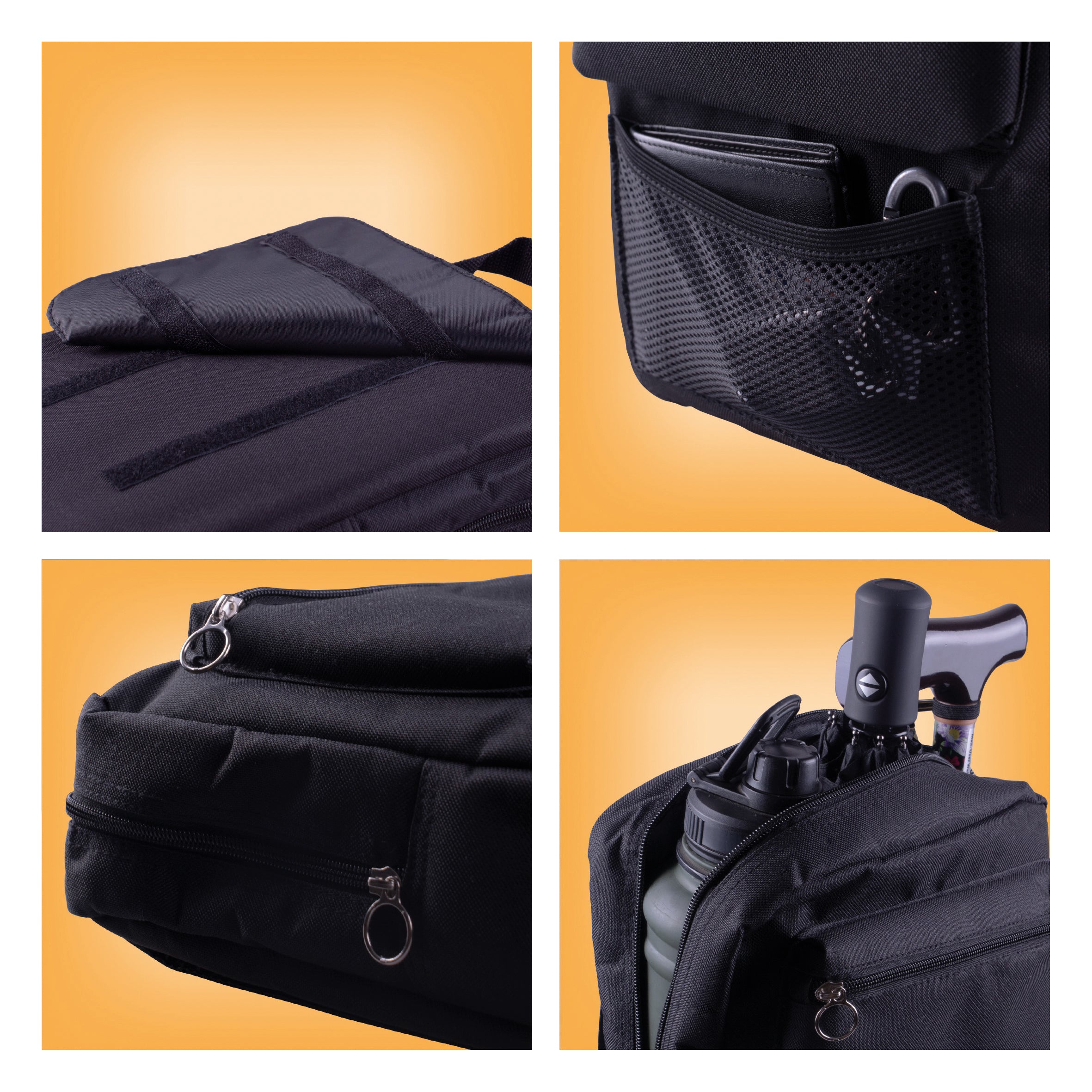 Mit einem stabilen Tragegriff an der Oberseite und einem breiten Klettverschluss auf der Rückseite lässt sich die Tasche sicher an der Armlehne Ihres Rollers befestigen, egal ob links oder rechts. Die Tasche hat einen großen Reißverschluss oben für einfachen Zugriff und verfügt im Inneren über ein Reißverschlussfach für Wertgegenstände wie Geld oder Kreditkarten sowie ein Außenfach mit Reißverschluss und ein kleines Netzfach für zusätzlichen Stauraum.