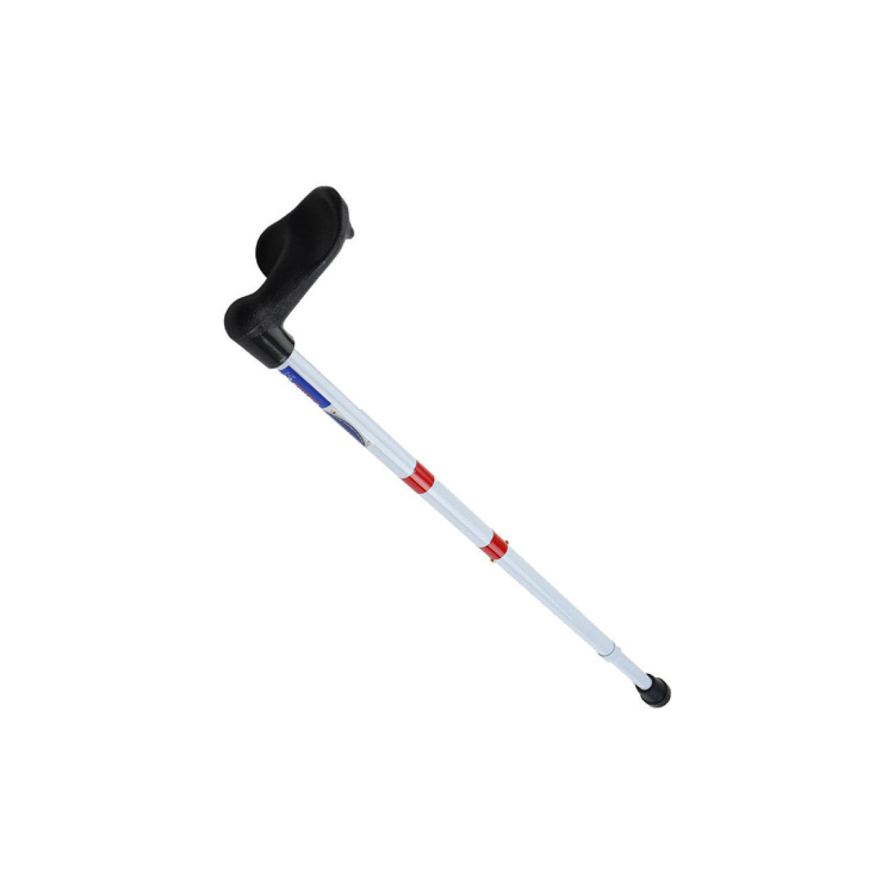 Dieser T-förmige Stützstock aus Aluminium verfügt über einen ergonomischen Griff für die linke Hand für zusätzlichen Komfort und Halt. Der Stock ist in stilvollem Weißmetallic lackiert und verfügt über zwei rote Reflektorstreifen für bessere Sichtbarkeit im Dunkeln.