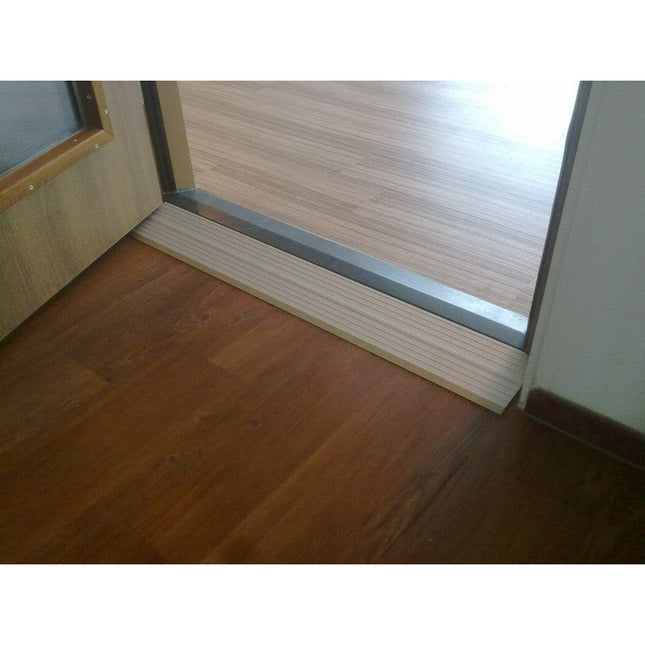 The threshold replacement is intended to replace existing thresholds in the home or as a threshold aid for small height differences of up to approximately 15 mm. These types of height differences occur, for example, when transitioning from tiles or laminate to carpeting. The maximum load is 300 kg. These threshold aids optimize accessibility and mobility in homes and buildings. Practical, effective and affordable. The aluminum threshold profiles and aids have a sophisticated shape and have a non-slip surface. The ribbed non-slip surface is easy to keep clean. If desired, the threshold profiles and aids can be adjusted to the desired size. The aluminum has a very scratch-resistant surface and therefore remains beautiful for a long time.
