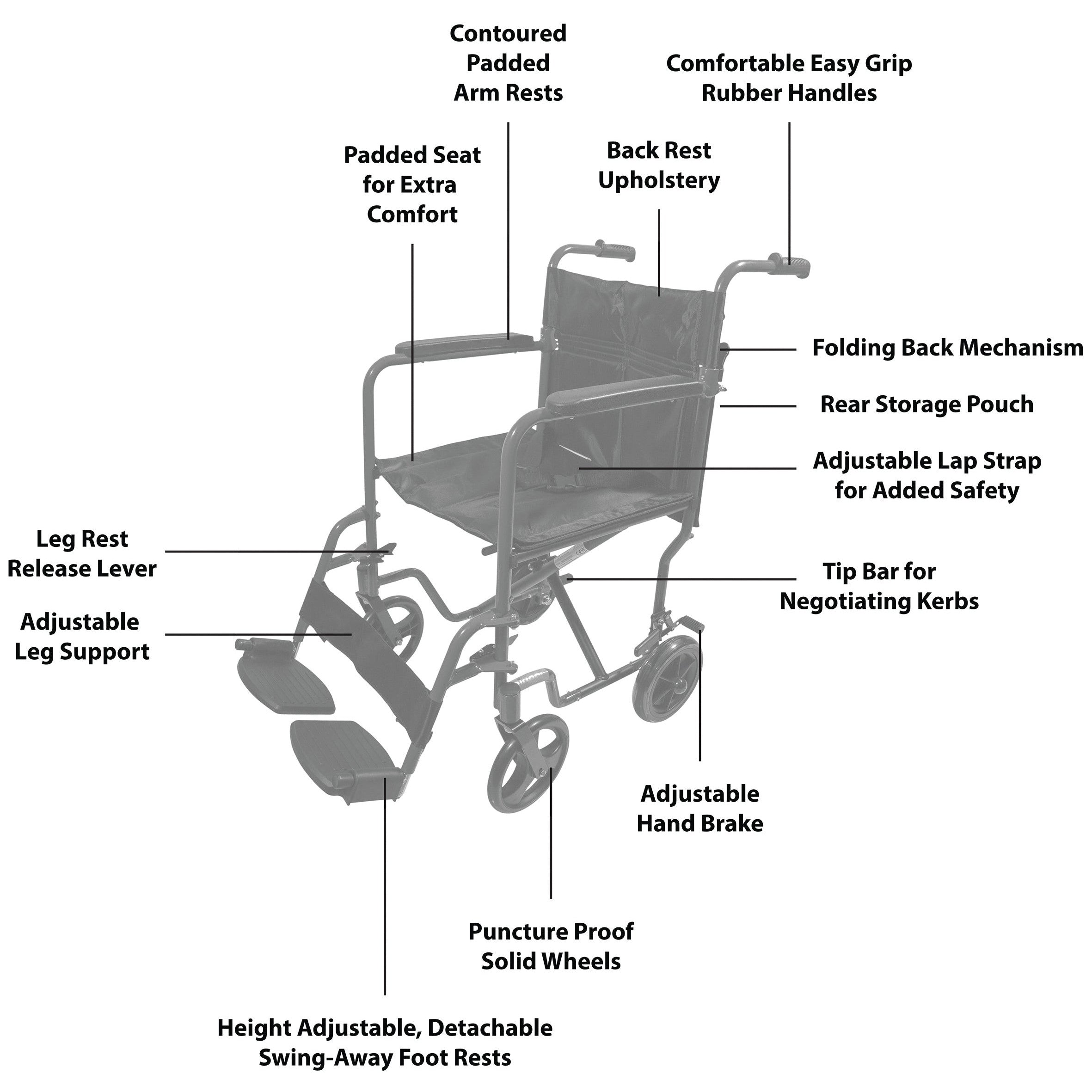Deze transportrolstoel biedt optimaal comfort met een 19-inch brede zitting, deluxe gevoerde nylon bekleding, en vaste PVC-armleuningen. De lekvrije 8-inch voor- en achterwielen en het handige parkeerremsysteem zorgen voor een veilige en soepele rit. Daarnaast zijn de verstelbare en wegklapbare voetsteunen voorzien van hielbanden voor extra ondersteuning. Een veiligheidsgordel wordt standaard meegeleverd.