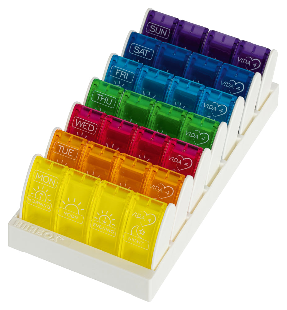Medicijnbox met 7 dagboxen in een houder voor iedere dag van de week. Iedere dagbox heeft 4 vakken met een... Lees meer