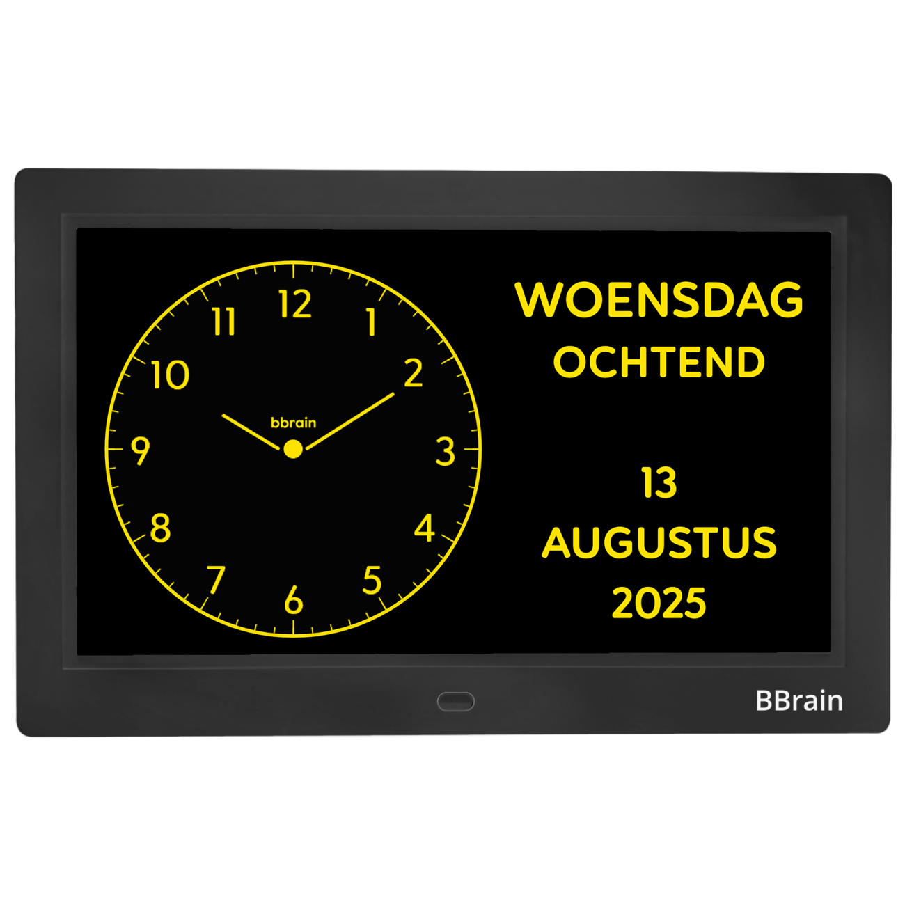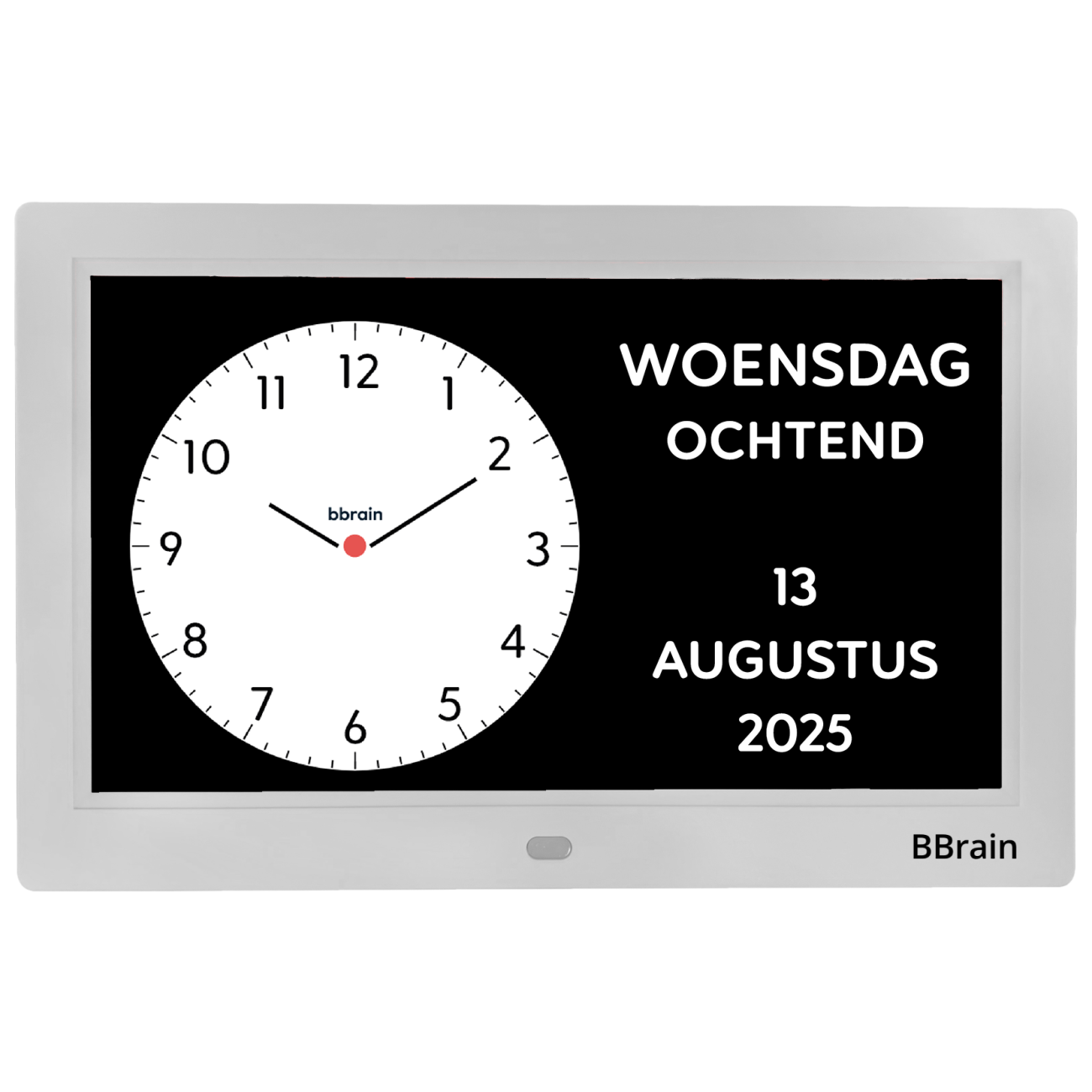 De BBrain Analoge WiFi Dementieklok is speciaal ontworpen om mensen met geheugenproblemen of cognitieve beperkingen overzicht, rust en structuur te bieden in het dagelijks leven. De klok toont duidelijk de tijd, datum, dag en dagdeel en is instelbaar in zowel analoge als digitale weergave.