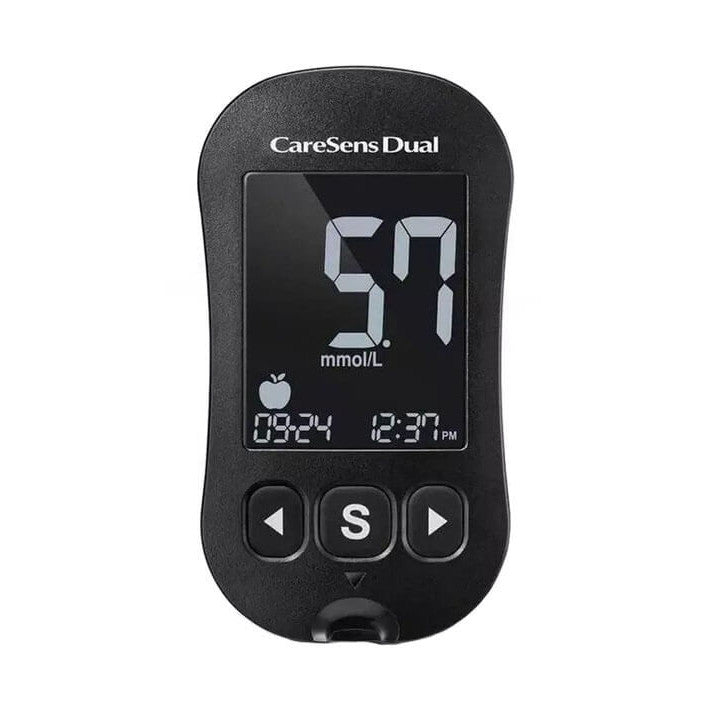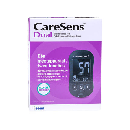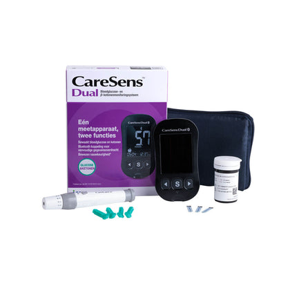 Volledig startpakket met de CareSens Dual glucose-/ketonenmeter. Met Bluetooth, stripuitwerper en geheugen voor 1000 metingen. Inclusief teststrips, prikpen, lancetten, batterijen en etui.
