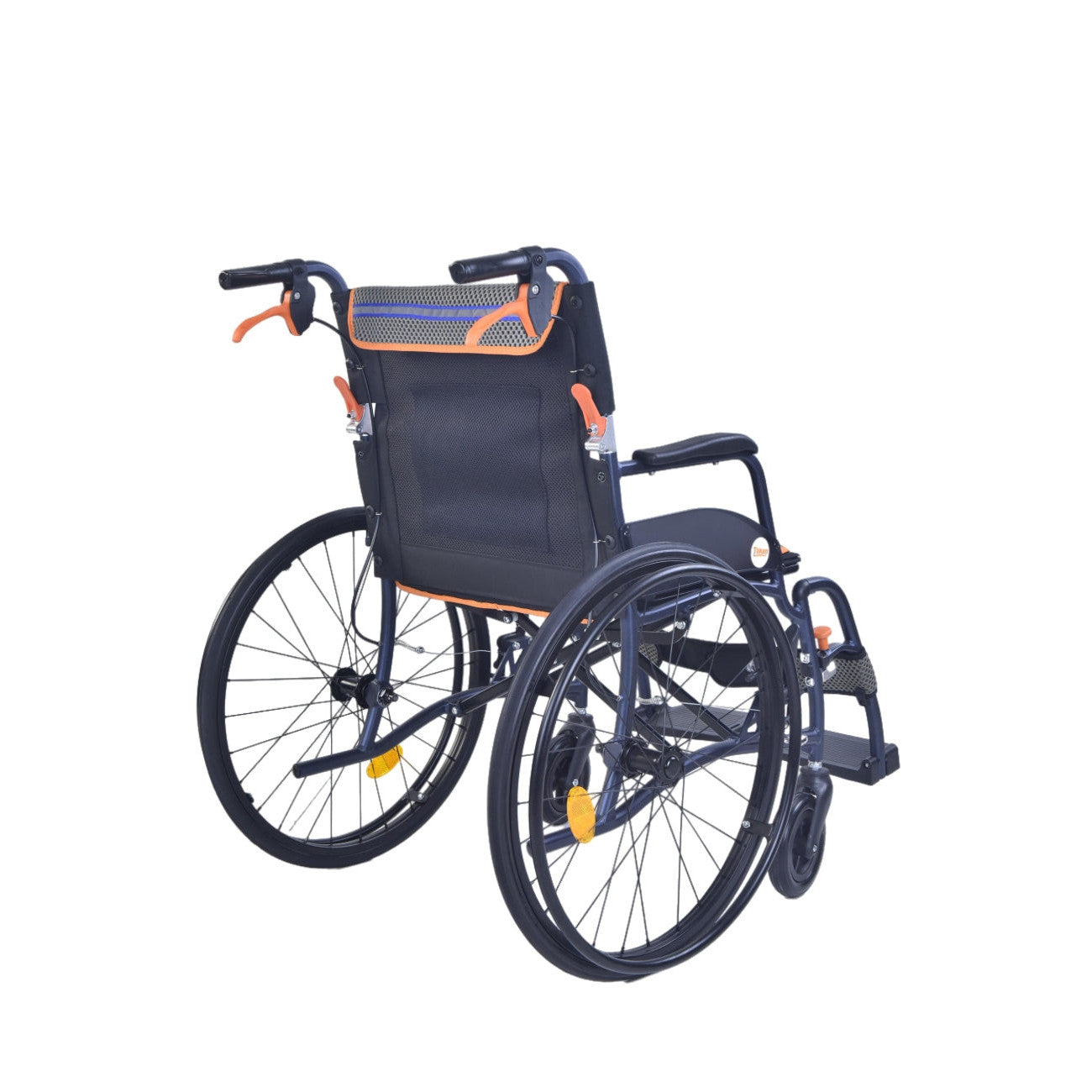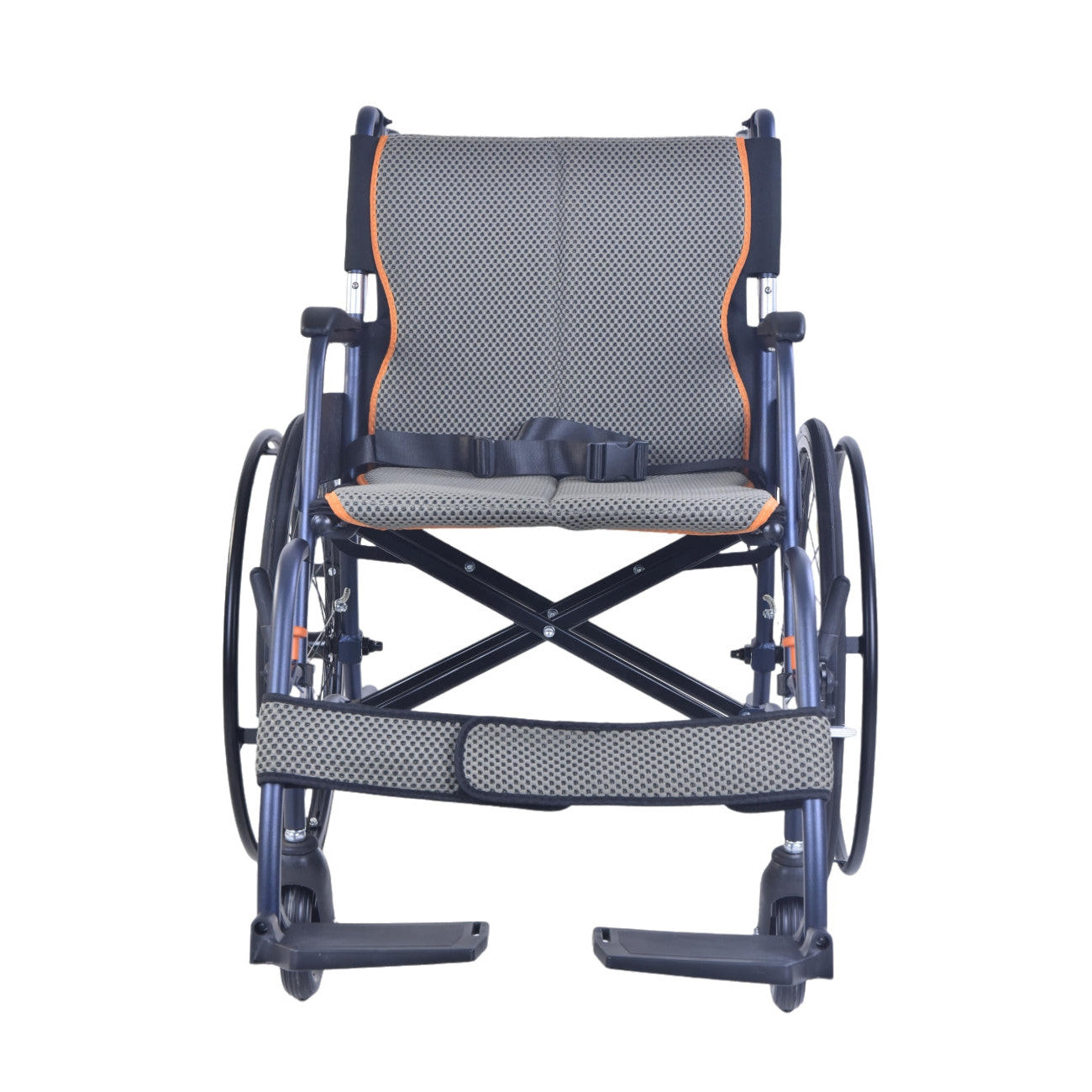 Het stevige blauwe frame met grijze mesh bekleding en oranje accenten biedt niet alleen comfort maar ook een eigentijdse uitstraling. Dankzij de inklapbare rugleuning, afneembare beensteunen en zelfvergrendelende zorgremmen is deze stoel praktisch, veilig en comfortabel voor zowel gebruiker als begeleider.