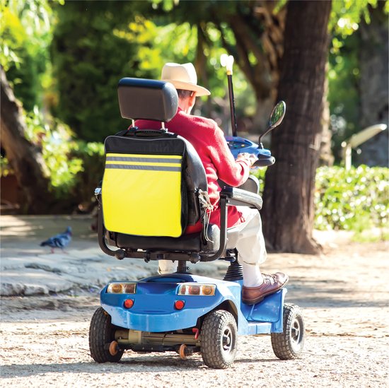 Deze goed zichtbare scootertas is speciaal ontworpen om veiligheid en gemak te combineren tijdens het gebruik van een scootmobiel. Dankzij de reflecterende elementen bent u ook in het donker of bij weinig licht goed zichtbaar, wat extra zekerheid biedt onderweg. De tas is volledig verstelbaar en past eenvoudig op de meeste standaard elektrische scooters.