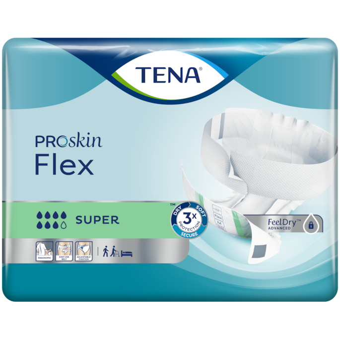 TENA Flex Super is een flexibel incontinentieverband met heupband, met een speciaal ontwerp waardoor het product eenvoudiger en ergonomischer kan worden verwisseld, geschikt voor mobiele, half-mobiele en minder mobiele mensen. Voor uitstekende bescherming leidt TENA ProSkin Flex met FeelDry Advanced™ het vocht snel weg van het oppervlak, zodat de huid droog blijft. De superabsorberende, snelwerkende kern sluit zelfs grotere hoeveelheden urine snel op voor een droog gevoel, en de volledig ademende achterzijde van ConfioAir™ zorgt dat de huid kan ademen. Al deze kenmerken zorgen dat de natuurlijke gezondheid van de huid wordt behouden. De verstelbare heupband van ComfiStretch™ zorgt voor een nauwsluitende pasvorm om het comfort te verhogen en betere bescherming te bieden tegen doorlekken. Voor gebruiksgemak is de heupband voorzien van klittenband die aan de voorzijde of aan de achterzijde kan worden bevestigd en volledig verstelbaar is voor verschillende lichaamstypes. TENA ProSkin Flex is beschikbaar in verschillende absorptiegraden en maten.