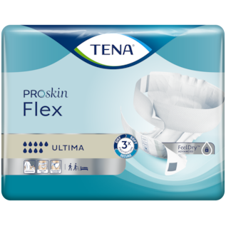 TENA Flex Ultima is een flexibel incontinentiebroekje met heupband, met een speciaal ontwerp waardoor het product eenvoudiger en ergonomischer kan worden verwisseld, geschikt voor mobiele, halfmobiele en minder mobiele mensen. Voor uitstekende bescherming leidt TENA ProSkin Flex met FeelDry Advanced™ het vocht snel weg van het oppervlak, zodat de huid droog blijft. De superabsorberende, snelwerkende kern sluit zelfs grotere hoeveelheden urine snel op voor een droog gevoel, en de volledig ademende achterzijde van ConfioAir™ zorgt dat de huid kan ademen. Al deze kenmerken zorgen dat de natuurlijke gezonde huid wordt behouden. De verstelbare heupband van ComfiStretch™ zorgt voor een nauwsluitende pasvorm om het comfort te verhogen en betere bescherming te bieden tegen doorlekken. Voor gebruiksgemak is de heupband voorzien van klittenband die aan de voorzijde kan worden bevestigd en volledig verstelbaar is voor verschillende lichaamstypes.